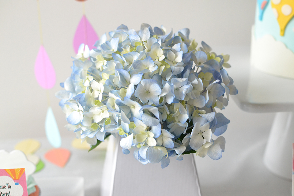 Flowers are always a great option to add to any Dessert Experience. With so many colors and styles of flowers in existence, you probably could find a flower to fit really any party or Experience you are ever going to throw. We choose hydrangeas for the Soar Experience - the color and style fit the table perfectly.