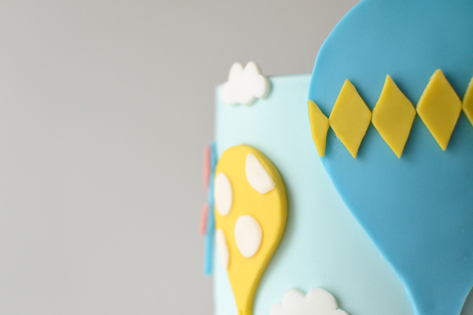 Covering a cake in fondant is NOT one of the easiest techniques to master. But the great thing about the Up In The Clouds Cake, is that you can cover your mistakes with a cloud border, mini clouds, or a hot air balloon. You can still practice perfecting your technique, knowing that you have some room to hide any mistakes